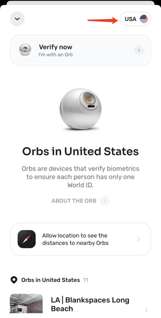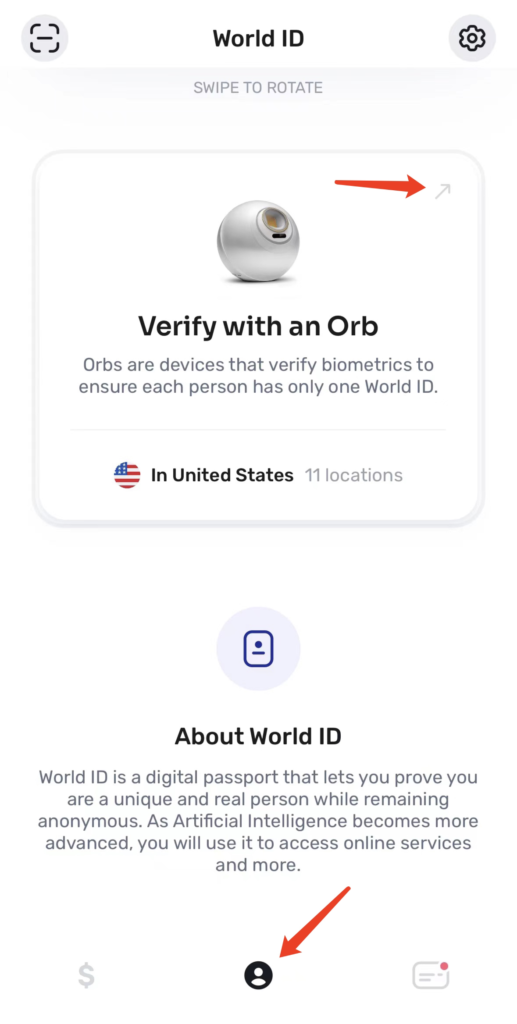 1. Open World App and switch to account page. Scroll down to “Verify with an Orb” and tap the arrow.